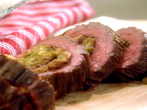 Fan the steak slices on a serving plate and garnish with the bone and the roasted garlic halves.
